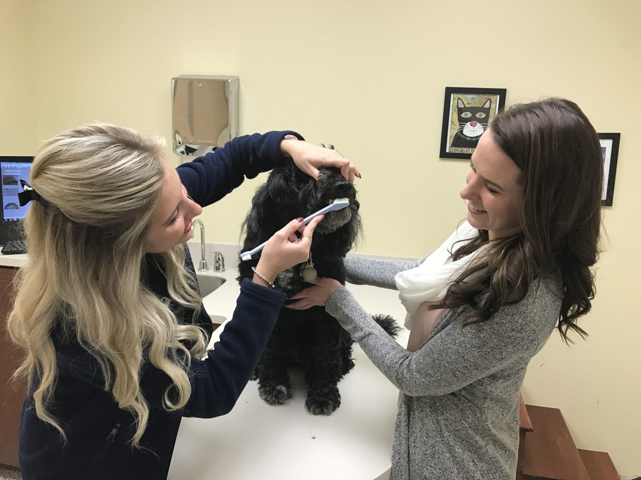 veterinarian showing a pet owner how to brush her dogs teeth